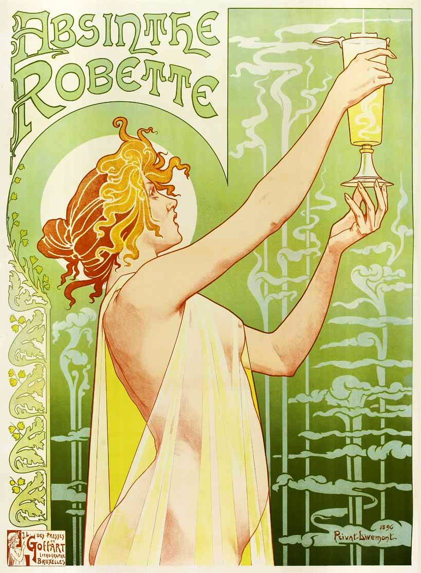 Kwintesencją tego zamiłowania mogą być wysublimowane plakaty Alfonsa Muchy czy też obraz Victora Olivy („Pijak absyntu”), na którym to z kieliszka absyntu niczym dżin wyłania się zielona zjawa o kształtach kobiety, ta iluzoryczna postać kusi i wabi pijącego, niby próbując przenieść go na jakąś „drugą stronę”.