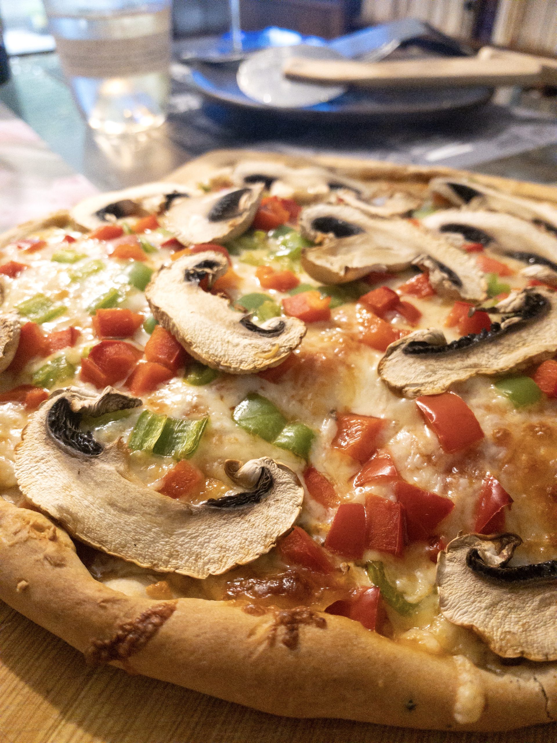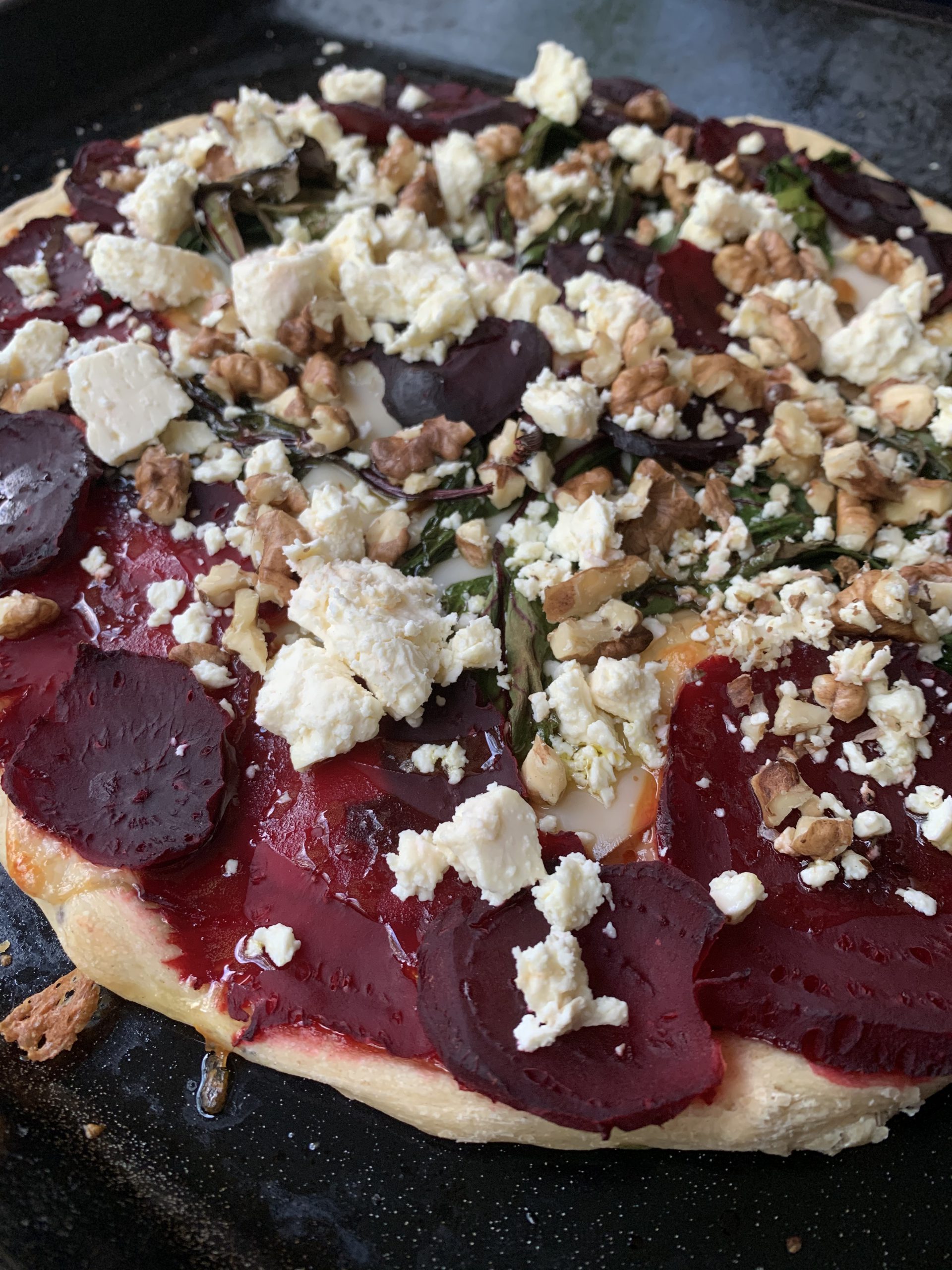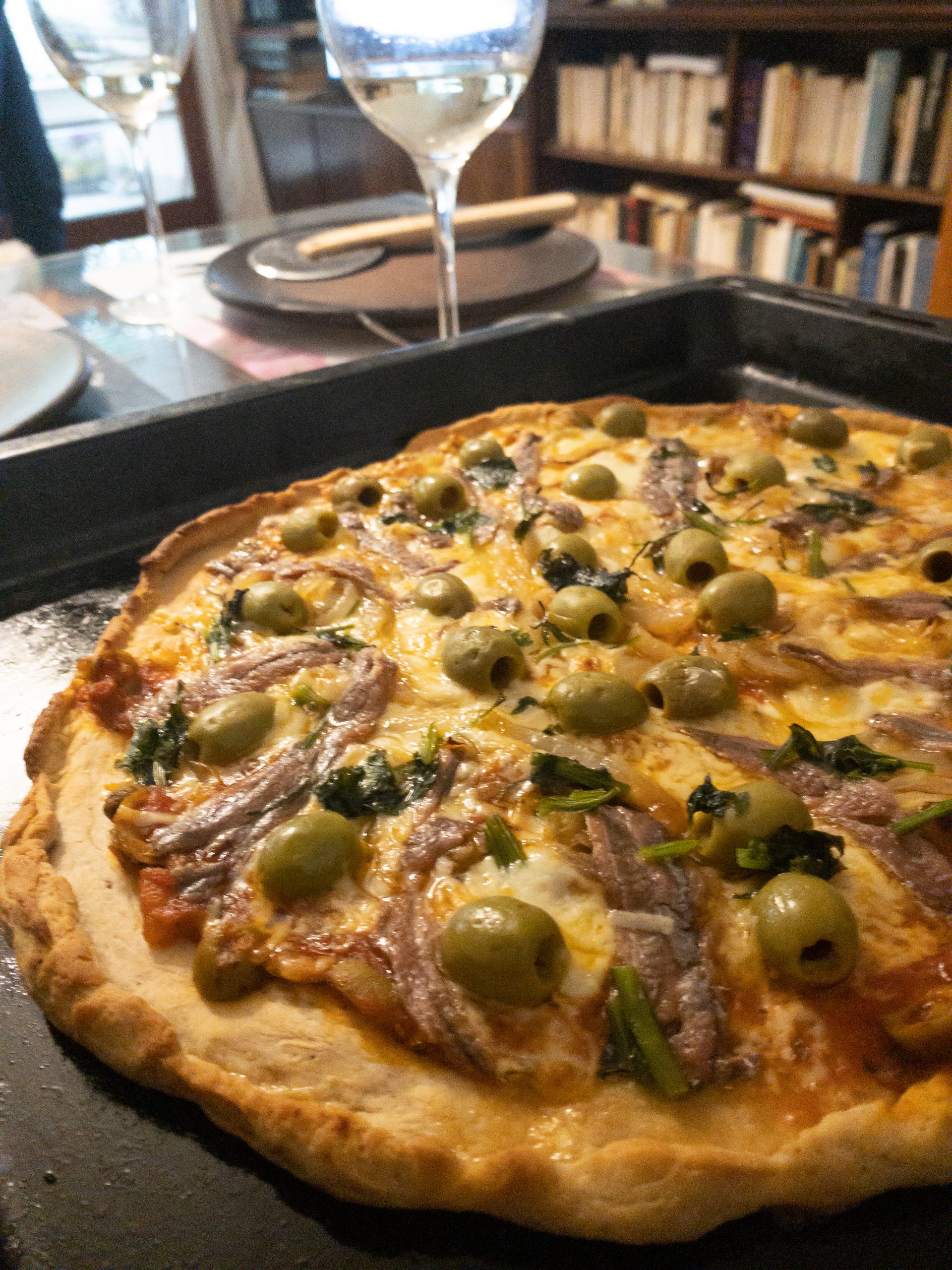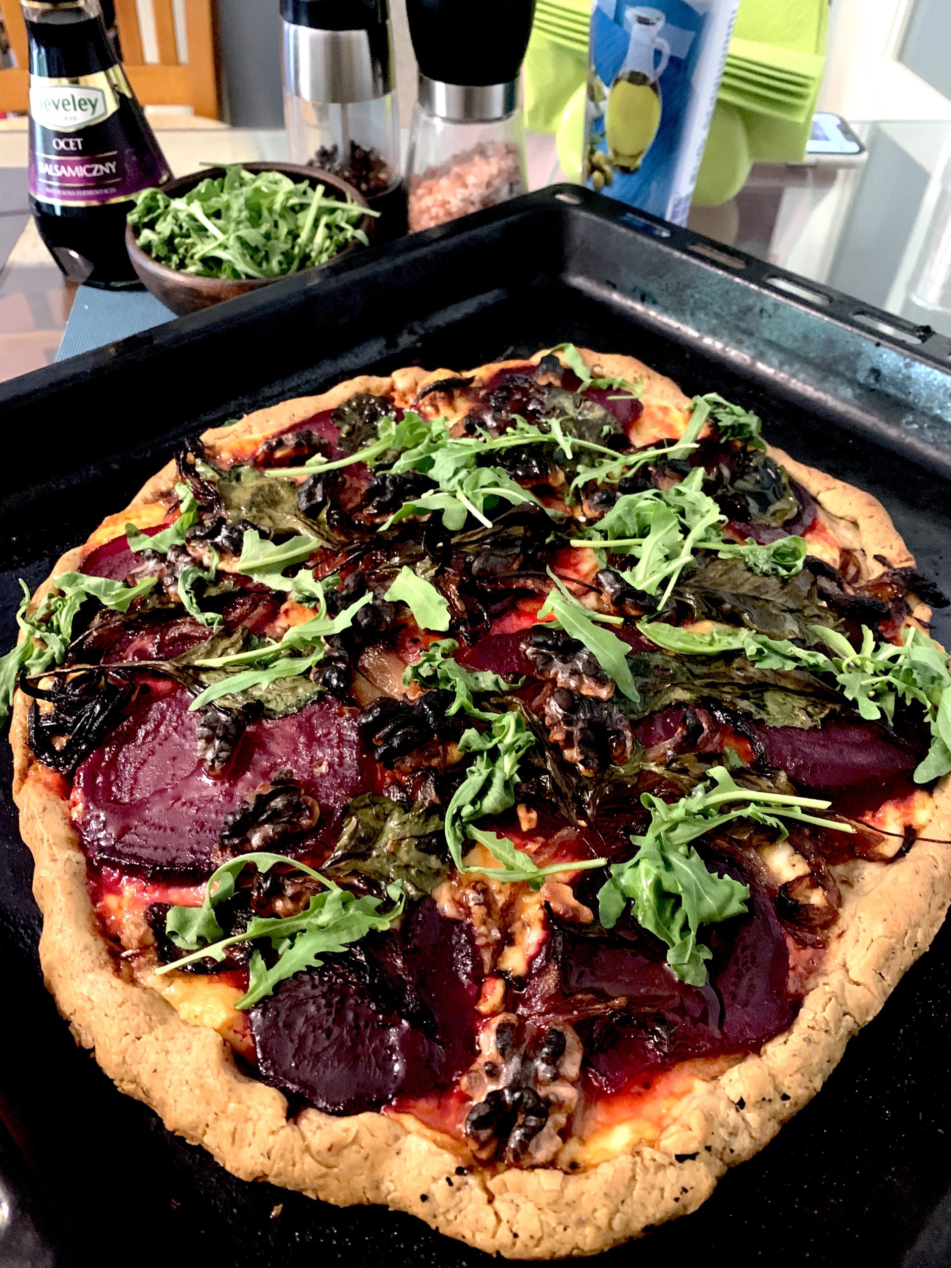 Przez te wszystkie lata eksperymentowaliśmy ze wszystkimi możliwymi rodzajami mąk, serów i dodatków a także połączeń z winami. Nieskromnie pochwalę się, że mój mąż robi genialne pizze. Bezapelacyjnym hitem jego autorstwa jest pizza po polsku z pieczonymi burakami, serem twarogowym, prażonymi orzechami włoskimi i zapiekanymi listkami botwinki. Zatem w naszym domu, to mąka tortowa orkiszowa, woda filtrowana, świeże drożdże, sól morska, kropla oliwy z oliwek, ugniatanie, wyrabianie, rozciąganie, a potem leżakowanie przez dobę. Następnie rozwałkowywanie, rozciąganie i formowanie podstawy do pizzy, na której zazwyczaj plus podstawowego sosu (oliwa, czosnek rozgnieciony, szalotka, pulpa z pomidorów, oregano, pieprz, sól, suszona bazylia) lądują różne dodatki. Zdarzały się też pizze bardzo szalone jak. Pizza hot dog z plasterkami parówek, pizza taco z frijoles fritos i guacamole czy pizza z kurczakiem tikka masala. To przede wszystkim doskonała zabawa, a do tego prawdziwa uczta.
