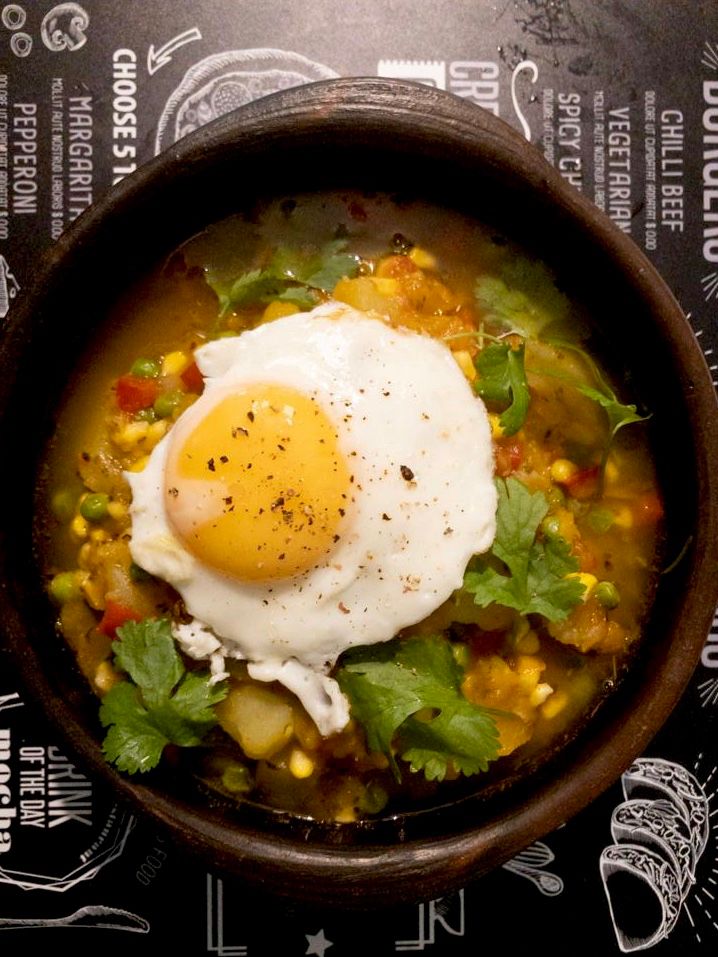 Dodaj mięso do warzyw i gotować bez przykrycia, aż płyn wyparuje. Nałożyć na talerz i podawać z jajkiem sadzonym