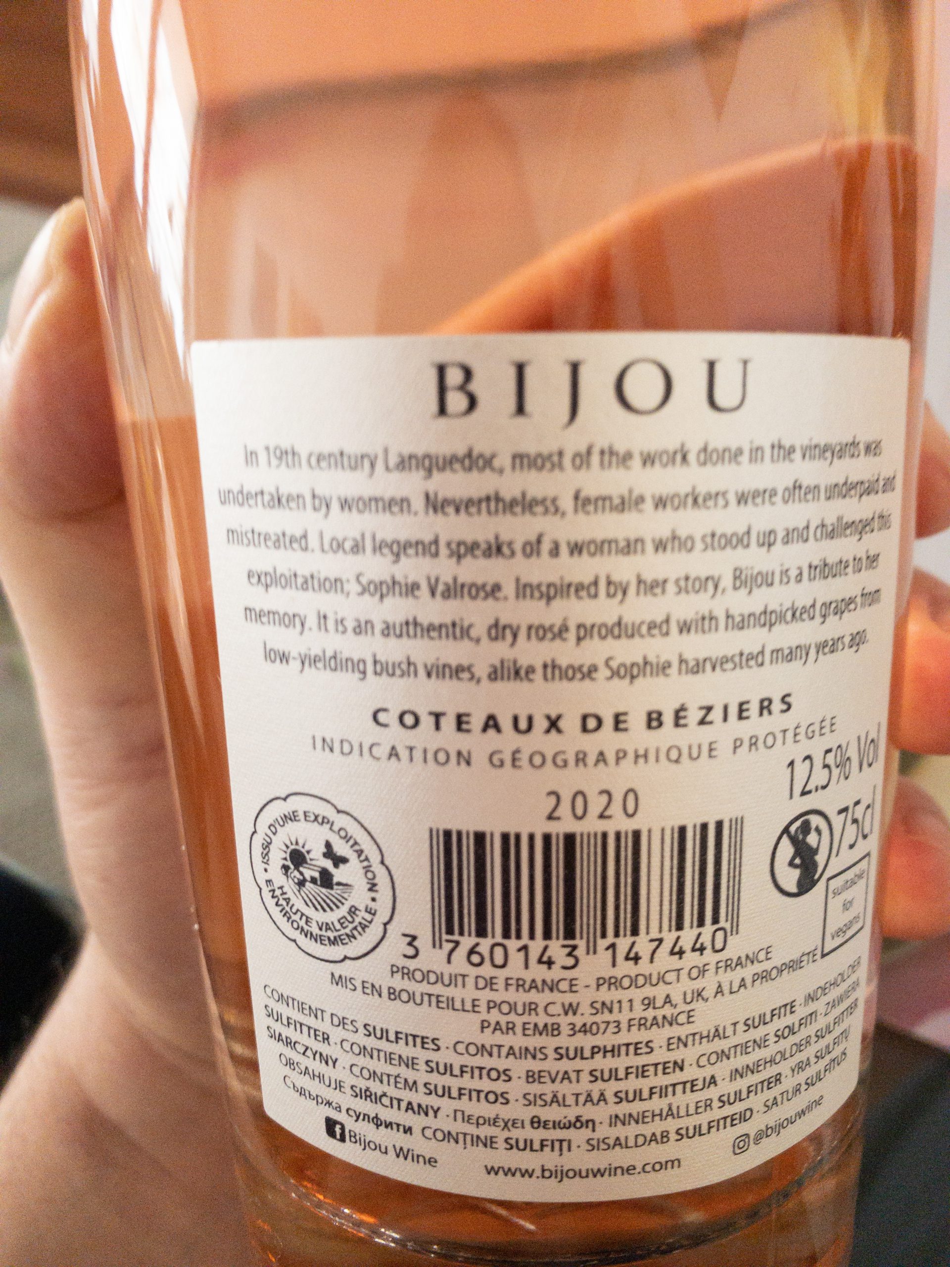 Nazwa Le Bijou de Sophie Valrose nawiązuje do kobiety, która pracowała w winnicach Langwedocji pod koniec XIX wieku i stała się kimś w rodzaju lokalnej bohaterki. W tamtych czasach w winnicach pracowały głównie kobiety; przycinały winorośl i zbierały winogrona. Niestety te kobiety były często źle traktowane, przepracowane i źle opłacane. Historycy badali rolę kobiet w tym okresie i wyjaśniali niektóre nierówności między płciami. Według nich kobiety w winnicach były uważane za gorsze. W związku z tym wykonywali podstawowe zadania, płacili o około 50% mniej niż mężczyźni i karmiono je gotowaną fasolą, podczas gdy mężczyźni cieszyli się kawałkiem mięsa po długim dniu spędzonym w winnicach. Co więcej, gdy dodano więcej ról wymagających umiejętności, kobietom nie wolno było się ich uczyć. Sophie walczyła o prawa kobiet i drastycznie poprawiła warunki pracy swoich koleżanek w winnicy, w której pracowała. Bijou Rosé jest hołdem dla niej. Na każdej butelce wina, na tylnej etykiecie można przeczytać o tej dzielnej kobiecie. To wino różowe jest wytwarzana z winogron pochodzących z ręcznie zbieranych zbiorów, takich jak te, które Sophie zbierała wiele lat temu.