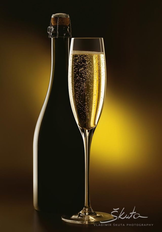 - butelka i kieliszek wina musującego